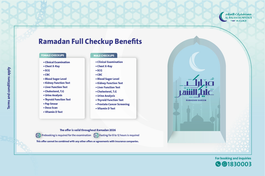 On the occasion of the holy month of Ramadan we wish you all good health and present to you our full Checkup Benefits.