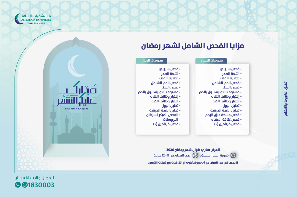 بمناسبة شهر رمضان المبارك نتمنى لكم كل الخير والصحة ونقدم لكم الفحص الطبي الشامل.