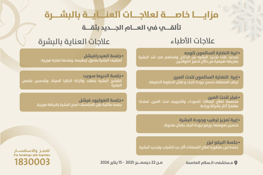 مزايا خاصة لعلاجات العناية بالبشرة - تألقي في العام الجديد بثقة (مستشفى السلام العاصمة)
